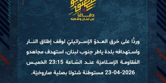 دفاعًا عن لبنان وشعبه، وردًّا على خرق العدوّ الإسرائيليّ لوقف إطلاق النار واستهدافه بلدة ياطر جنوب لبنان، استهدف مجاهدو المُقاومة الإسلاميّة عند السّاعة 23:15 الخميس 23-04-2026 مستوطنة شتولا بصلية صاروخيّة.
