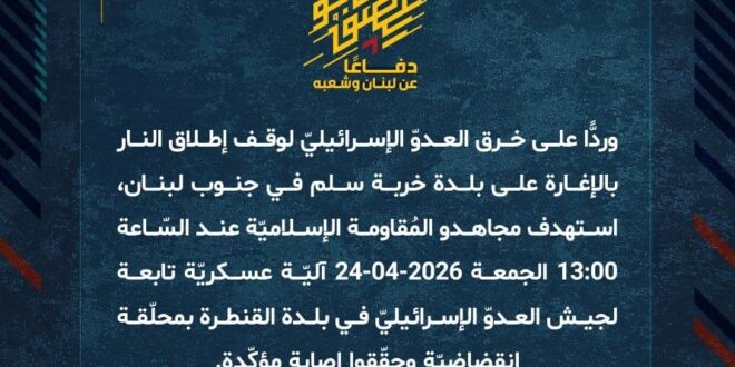 دفاعًا عن لبنان وشعبه، وردًّا على خرق العدوّ الإسرائيليّ لوقف إطلاق النار بالإغارة على بلدة خربة سلم في جنوب لبنان، استهدف مجاهدو المُقاومة الإسلاميّة عند السّاعة 13:00 الجمعة 24-04-2026 آليّة عسكريّة تابعة لجيش العدوّ الإسرائيليّ في بلدة القنطرة بمحلّقة انقضاضيّة وحقّقوا إصابة مؤكّدة.