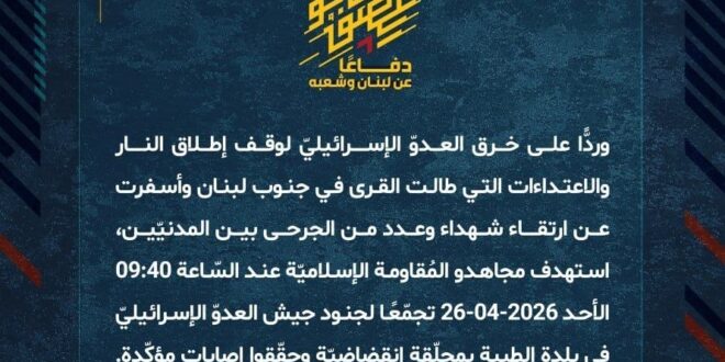 دفاعًا عن لبنان وشعبه، وردًّا على خرق العدوّ الإسرائيليّ لوقف إطلاق النار والاعتداءات التي طالت القرى في جنوب لبنان وأسفرت عن ارتقاء شهداء وعدد من الجرحى بين المدنيّين، استهدف مجاهدو المُقاومة الإسلاميّة عند السّاعة 09:40 الأحد 26-04-2026 تجمّعًا لجنود جيش العدوّ الإسرائيليّ في بلدة الطيبة بمحلّقة انقضاضيّة وحقّقوا إصابات مؤكّدة.