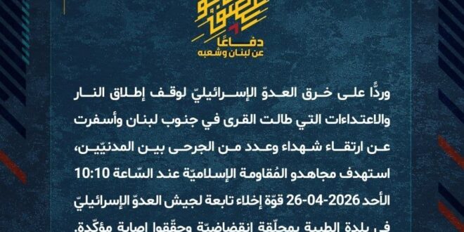 دفاعًا عن لبنان وشعبه، وردًّا على خرق العدوّ الإسرائيليّ لوقف إطلاق النار والاعتداءات التي طالت القرى في جنوب لبنان وأسفرت عن ارتقاء شهداء وعدد من الجرحى بين المدنيّين، استهدف مجاهدو المُقاومة الإسلاميّة عند السّاعة 10:10 الأحد 26-04-2026 قوّة إخلاء تابعة لجيش العدوّ الإسرائيليّ في بلدة الطيبة بمحلّقة انقضاضيّة وحقّقوا إصابة مؤكّدة.