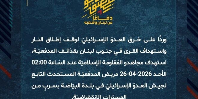 دفاعًا عن لبنان وشعبه، وردًّا على خرق العدوّ الإسرائيليّ لوقف إطلاق النار واستهداف القرى في جنوب لبنان بقذائف المدفعيّة، استهدف مجاهدو المُقاومة الإسلاميّة عند السّاعة 02:00 الأحد 26-04-2026 مربض المدفعيّة المستحدث التابع لجيش العدوّ الإسرائيليّ في بلدة البيّاضة بسربٍ من المسيّرات الانقضاضيّة.