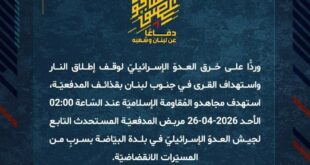 دفاعًا عن لبنان وشعبه، وردًّا على خرق العدوّ الإسرائيليّ لوقف إطلاق النار والاعتداءات التي طالت القرى في جنوب لبنان وأسفرت عن ارتقاء شهداء وعدد من الجرحى بين المدنيّين، استهدف مجاهدو المُقاومة الإسلاميّة عند السّاعة 17:45 الأحد 26-04-2026 دبّابة ميركافا في ساحة بلدة الطيبة بمحلّقتين انقضاضيّتين وحقّقوا إصابة مؤكّدة.