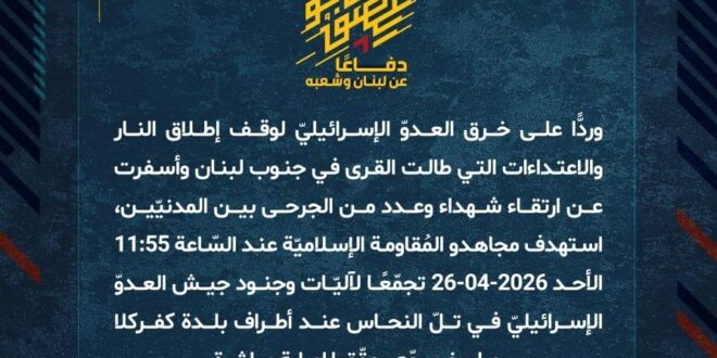 دفاعًا عن لبنان وشعبه، وردًّا على خرق العدوّ الإسرائيليّ لوقف إطلاق النار والاعتداءات التي طالت القرى في جنوب لبنان وأسفرت عن ارتقاء شهداء وعدد من الجرحى بين المدنيّين، استهدف مجاهدو المُقاومة الإسلاميّة عند السّاعة 11:55 الأحد 26-04-2026 تجمّعًا لآليّات وجنود جيش العدوّ الإسرائيليّ في تلّ النحاس عند أطراف بلدة كفركلا بصاروخ موجّه وحقّقوا إصابة مباشرة.
