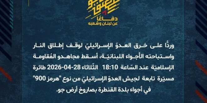 دفاعًا عن لبنان وشعبه، وردًّا على خرق العدوّ الإسرائيليّ لوقف إطلاق النار واستباحته الأجواء اللبنانيّة، أسقط مجاهدو المُقاومة الإسلاميّة عند السّاعة 18:10 الثّلاثاء 28-04-2026 طائرة مسيّرة تابعة لجيش العدوّ الإسرائيليّ من نوع “هرمز 900” في أجواء بلدة القنطرة بصاروخ أرض جو.