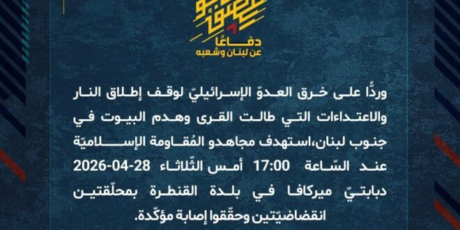 دفاعًا عن لبنان وشعبه، وردًّا على خرق العدوّ الإسرائيليّ لوقف إطلاق النار والاعتداءات التي طالت القرى وهدم البيوت في جنوب لبنان، استهدف مجاهدو المُقاومة الإسلاميّة عند السّاعة 17:00 أمس الثّلاثاء 28-04-2026 دبابتيّ ميركافا في بلدة القنطرة بمحلّقتين انقضاضيّتين وحقّقوا إصابة مؤكّدة.
