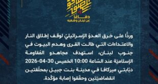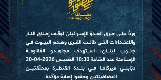 دفاعًا عن لبنان وشعبه، وردًّا على خرق العدوّ الإسرائيليّ لوقف إطلاق النار والاعتداءات التي طالت القرى وهدم البيوت في جنوب لبنان، استهدف مجاهدو المُقاومة الإسلاميّة عند السّاعة 10:30 الخميس 30-04-2026 دبّابتي ميركافا في بلدة القنطرة بمحلّقتين انقضاضيّتين وحقّقوا إصابة مؤكّدة.