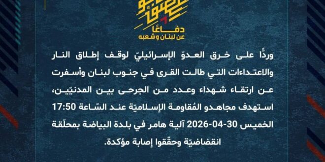 دفاعًا عن لبنان وشعبه، وردًّا على خرق العدوّ الإسرائيليّ لوقف إطلاق النار والاعتداءات التي طالت القرى في جنوب لبنان وأسفرت عن ارتقاء شهداء وعدد من الجرحى بين المدنيّين، استهدف مجاهدو المُقاومة الإسلاميّة عند السّاعة 17:50 الخميس 30-04-2026 آلية هامر في بلدة البياضة بمحلّقة انقضاضيّة وحقّقوا إصابة مؤكدة.