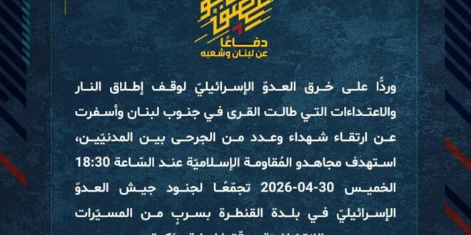 دفاعًا عن لبنان وشعبه، وردًّا على خرق العدوّ الإسرائيليّ لوقف إطلاق النار والاعتداءات التي طالت القرى في جنوب لبنان وأسفرت عن ارتقاء شهداء وعدد من الجرحى بين المدنيّين، استهدف مجاهدو المُقاومة الإسلاميّة عند السّاعة 18:30 الخميس 30-04-2026 تجمّعًا لجنود جيش العدوّ الإسرائيليّ في بلدة القنطرة بسربٍ من المسيّرات الانقضاضيّة وحقّقوا إصابة مؤكدة.