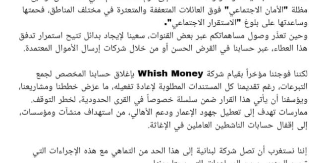 لحساب التبرعات الخاص بها أهلنا الكرام، أهل الخير والعطاء.. منذ انطلاقة جمعيتنا “وتعاونوا”، كنا نستند إلى كرم مساهماتكم التي مكّنتنا من توسيع مظلة“الأمان الاجتماعي” فوق العائلات المتعففة والمتعثرة في مختلف المناطق، فحمتها وساعدتها على بلوغ “الاستقرار الاجتماعي”. وحين تعذّر وصول مساهماتكم عبر بعض القنوات، سعينا لإيجاد بدائل تتيح استمرار تدفق هذا العطاء، عبر حسابنا في القرض الحسن أو من خلال شركات إرسال الأموال المعتمدة. لكننا فوجئنا مؤخراً بقيام شركة Whish Money بإغلاق حسابنا المخصص لجمع التبرعات، رغم تقديمنا كل المستندات المطلوبة لإعادة تفعيله، ما عرّض خططنا ومشاريعنا، خصوصاً في القرى الحدودية، لخطر التوقف. ويؤسفنا أن يأتي هذا القرار ضمن سلسلة ممارسات تهدف إلى تعطيل جهود الإعمار ودعم الأهالي، من استهداف منشآت ومؤسسات، إلى إقفال حسابات الناشطين العاملين في الإغاثة. إننا نستغرب أن تصل شركة لبنانية إلى هذا الحد من التماهي مع هذه الإجراءات التي تحرم الجنوبيين من المساعدات التي يحتاجونها. وعليه، نرجو منكم التوقف عن إرسال الأموال إلى الحساب المرتبط برقم الهاتف 70826533 لدى شركة Whish Money، والتواصل معنا عبره لتحديد الطريقة الأنسب والأسرع لتسليم مساهماتكم، كما نذكر بأننا نواصل تلقي مساهماتكم عبر حساب الجمعية لدى “مؤسسة القرض الحسن” رقم : 1 – 0 – 32 – 817