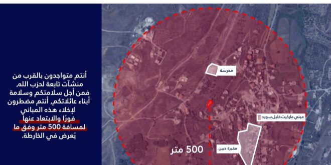 أنتم تتواجدون في مباني يستخدمها حزب الله . من أجل سلامتكم انتم مضطرون لاخلاء تلك المباني والمباني المجاورة لها فورًا والابتعاد عنها لمسافة لا تقل عن 500 متر.
