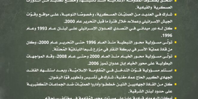 – أوكلت إليه مهام قيادية عليا على مستوى محور المُقاومة في مختلف ساحاته.
