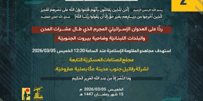 ردًّا على العدوان الإسرائيلي المجرم الذي طال عشرات المدن والبلدات اللبنانيّة بما فيها ضاحية بيروت الجنوبيّة، استهدف مجاهدو المقاومة الإسلاميّة عند الساعة 12:20 من ظهر اليوم الخميس 05/03/2026 مجمّع الصناعات العسكريّة التابعة لشركة رفائيل جنوب مدينة عكّا بصلية صاروخيّة.