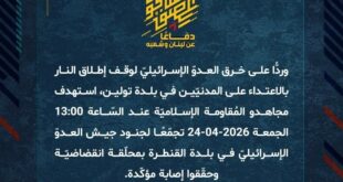 ردًّا على العدوان الإسرائيلي المجرم الذي طال عشرات المدن والبلدات اللبنانيّة بما فيها ضاحية بيروت الجنوبيّة، استهدف مجاهدو المُقاومة الإسلاميّة عند الساعة 17:00 من مساء اليوم الخميس 05/03/2026، تجمّعًا لآليات جيش العدوّ الإسرائيلي في الموقع المُستحدث في بلدة مركبا بصليةٍ صاروخيّة.