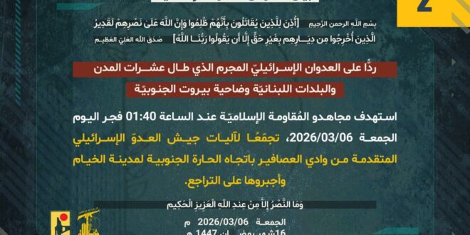 ردًّا على العدوان الإسرائيلي المجرم الذي طال عشرات المدن والبلدات اللبنانيّة بما فيها ضاحية بيروت الجنوبيّة، استهدف مجاهدو المُقاومة الإسلاميّة عند الساعة 01:40 من فجر اليوم الجمعة 06/03/2026 تجمّعًا لآليات جيش العدوّ الإسرائيلي المتقدمة من وادي العصافير باتجاه الحارة الجنوبية لمدينة الخيام وحقّقوا إصابات مباشرة في صفوفها وأجبروها على التراجع.