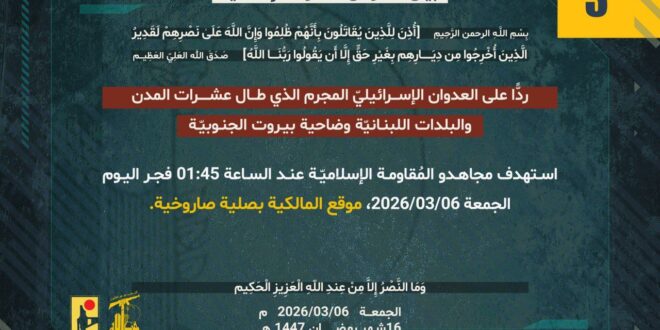 ردًّا على العدوان الإسرائيلي المجرم الذي طال عشرات المدن والبلدات اللبنانيّة بما فيها ضاحية بيروت الجنوبيّة، استهدف مجاهدو المُقاومة الإسلاميّة عند الساعة 01:45 فجر اليوم الجمعة 06/03/2026 موقع المالكية بصلية صاروخية.