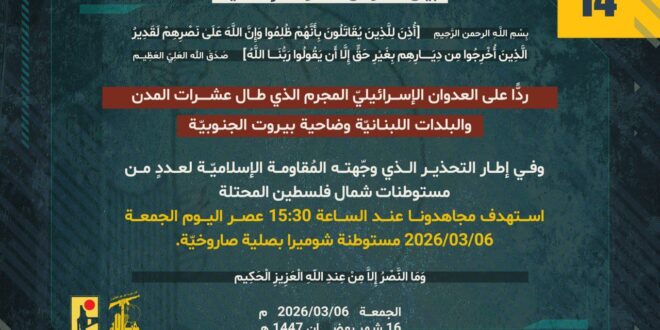 ردًّا على العدوان الإسرائيلي المجرم الذي طال عشرات المدن والبلدات اللبنانيّة بما فيها ضاحية بيروت الجنوبيّة، وفي إطار التحذير الذي وجّهته المُقاومة الإسلاميّة لعددٍ من مستوطنات شمال فلسطين المحتلة، استهدف مجاهدونا عند الساعة 15:30 من عصر اليوم الجمعة 06/03/2026 مستوطنة شوميرا بصلية صاروخيّة.