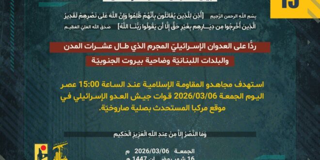 ردًّا على العدوان الإسرائيلي المجرم الذي طال عشرات المدن والبلدات اللبنانيّة بما فيها ضاحية بيروت الجنوبيّة، استهدف مجاهدو المقاومة الإسلامية عند الساعة 15:00 عصر اليوم الجمعة 06/03/2026 قوات جيش العدو الإسرائيلي في موقع مركبا المستحدث بصلية صاروخيّة.