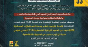 ردًّا على العدوان الإسرائيلي المجرم الذي طال عشرات المدن والبلدات اللبنانيّة بما فيها ضاحية بيروت الجنوبيّة، وبعد محاولة قوة من الجيش الإسرائيلي التقدم إلى “منطقة الخانوق” في قرية عيترون عند الساعة 20:40 من مساء اليوم السبت 07/03/2026 استهدفها مجاهدو المقاومة الإسلامية بقذائف المدفعية.