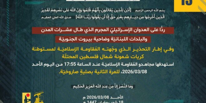 ردًّا على العدوان الإسرائيلي المجرم الذي طال عشرات المدن والبلدات اللبنانيّة وضاحية بيروت الجنوبيّة، وفي إطار التحذير الذي وجّهته المُقاومة الإسلاميّة لمستوطنة كريات شمونة شمال فلسطين المحتلّة، استهدفها مجاهدو المُقاومة الإسلاميّة عند الساعة 17:55 من اليوم الأحد 08/03/2026 للمرة الثانية بصليةٍ صاروخيّة.
