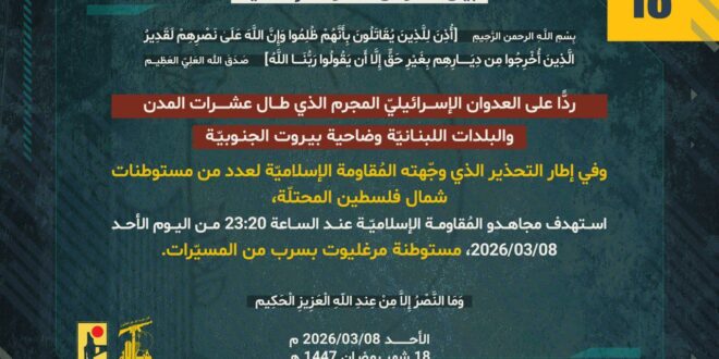 ردًّا على العدوان الإسرائيلي المجرم الذي طال عشرات المدن والبلدات اللبنانيّة وضاحية بيروت الجنوبيّة، وفي إطار التحذير الذي وجّهته المُقاومة الإسلاميّة لعدد من مستوطنات شمال فلسطين المحتلّة، استهدف مجاهدو المُقاومة الإسلاميّة عند الساعة 23:20 من اليوم الأحد 08/03/2026 مستوطنة مرغليوت بسرب من المسيّرات.