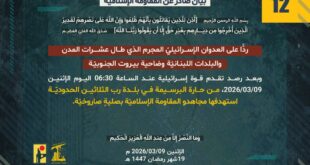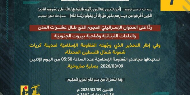 ردًّا على العدوان الإسرائيلي المجرم الذي طال عشرات المدن والبلدات اللبنانيّة وضاحية بيروت الجنوبيّة، وفي إطار التحذير الذي وجّهته المُقاومة الإسلاميّة لمدينة كريات شمونة شمال فلسطين المحتلّة، استهدفها مجاهدو المُقاومة الإسلاميّة عند الساعة 05:50 من اليوم الإثنين 09/03/2026 بصليةٍ صاروخيّة.