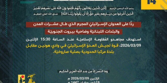 ردًّا على العدوان الإسرائيلي المجرم الذي طال عشرات المدن والبلدات اللبنانيّة وضاحية بيروت الجنوبيّة، استهدف مجاهدو المُقاومة الإسلاميّة عند الساعة 15:30 من عصر اليوم الإثنين 09/03/2026 قوة لجيش العدوّ الإسرائيليّ في وادي هونين مقابل بلدة مركبا الحدودية بصلية صاروخيّة.