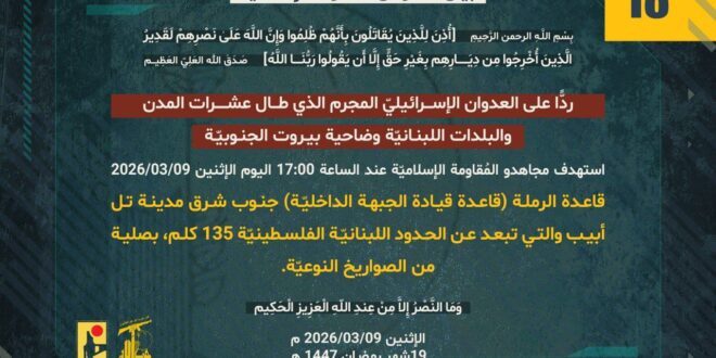 ردًّا على العدوان الإسرائيلي المجرم الذي طال عشرات المدن والبلدات اللبنانيّة وضاحية بيروت الجنوبيّة، استهدف مجاهدو المُقاومة الإسلاميّة عند الساعة 17:00 الإثنين 09/03/2026 قاعدة الرملة (قاعدة قيادة الجبهة الداخليّة) جنوب شرق مدينة تل أبيب والتي تبعد عن الحدود اللبنانيّة الفلسطينيّة 135 كلم، بصليةٍ من الصواريخ النوعيّة.