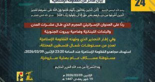 ردًّا على العدوان الإسرائيلي المجرم الذي طال عشرات المدن والبلدات اللبنانيّة وضاحية بيروت الجنوبيّة، استهدف مجاهدو المُقاومة الإسلاميّة عند الساعة 08:55 اليوم الإثنين 09/03/2026 موقع العبّاد مقابل بلدة حولا الحدوديّة بصلية صاروخيّة.