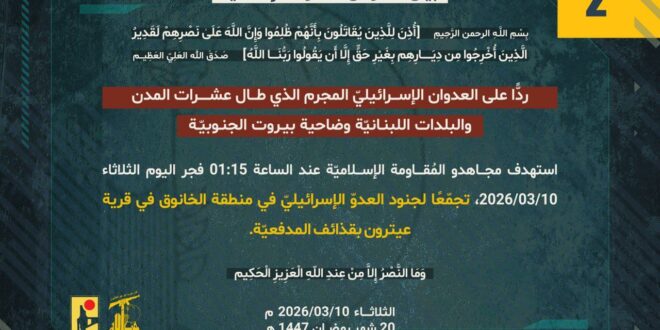 ردًّا على العدوان الإسرائيليّ المجرم الذي طال عشرات المدن والبلدات اللبنانيّة وضاحية بيروت الجنوبيّة، استهدف مجاهدو المُقاومة الإسلاميّة عند الساعة 01:15 فجر اليوم الثلاثاء 10/03/2026 تجمّعًا لجنود العدوّ الإسرائيليّ في منطقة الخانوق في قرية عيترون بقذائف المدفعيّة.