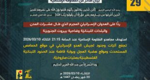 ردًّا على العدوان الإسرائيليّ المجرم الذي طال عشرات المدن والبلدات اللبنانيّة وضاحية بيروت الجنوبيّة، استهدف مجاهدو المُقاومة الإسلاميّة عند الساعة 15:00 الثلاثاء 10/03/2026 تجمّع جنود لجيش العدوّ الإسرائيليّ في وادي العصافير جنوب مدينة الخيام بصلية صاروخيّة.