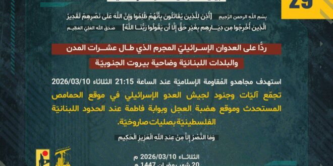 ردًّا على العدوان الإسرائيليّ المجرم الذي طال عشرات المدن والبلدات اللبنانيّة وضاحية بيروت الجنوبيّة، استهدف مجاهدو المُقاومة الإسلاميّة عند الساعة 21:15 الثلاثاء 10/03/2026 تجمّع آليّات وجنود لجيش العدو الإسرائيلي في موقع الحمامص المستحدث وموقع هضبة العجل وبوابة فاطمة عند الحدود اللبنانيّة الفلسطينيّة بصليات صاروخيّة.