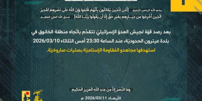 بعد رصد قوّة لجيش العدوّ الإسرائيليّ تتقدّم باتّجاه منطقة الخانوق في بلدة عيترون الحدوديّة، عند الساعة 23:30 أمس الثلاثاء 10/03/2026، استهدفها مجاهدو المُقاومة الإسلاميّة بصليات صاروخيّة.