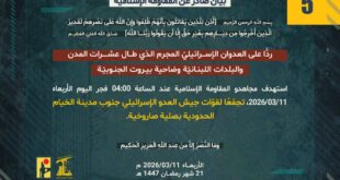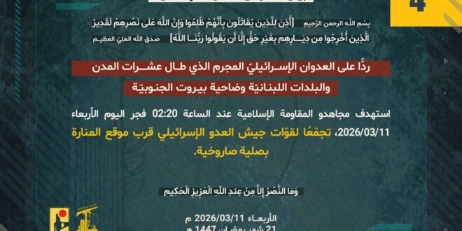 ردًّا على العدوان الإسرائيلي المجرم الذي طال عشرات المدن والبلدات اللبنانيّة بما فيها ضاحية بيروت الجنوبيّة، استهدف مجاهدو المقاومة الإسلامية عند الساعة 02:20 فجر اليوم الأربعاء 11/03/2026 تجمّعًا لقوّات جيش العدو الإسرائيلي قرب موقع المنارة بصلية صاروخية.