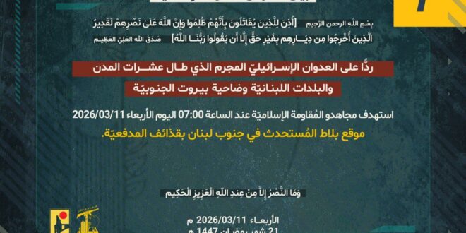 ردًّا على العدوان الإسرائيلي المجرم الذي طال عشرات المدن والبلدات اللبنانيّة بما فيها ضاحية بيروت الجنوبيّة، استهدف مجاهدو المُقاومة الإسلاميّة عند الساعة 07:00 اليوم الأربعاء 11/03/2026، موقع بلاط المُستحدث في جنوب لبنان بقذائف المدفعيّة.