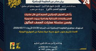 ردًّا على العدوان الإسرائيلي المجرم الذي طال عشرات المدن والبلدات اللبنانيّة بما فيها ضاحية بيروت الجنوبيّة، وضمن سلسلة عمليّات العصف المأكول، وفي إطار التحذير الذي وجّهته المُقاومة الإسلاميّة لعددٍ من مستوطنات شمال فلسطين المحتلة، استهدف مجاهدو المُقاومة الإسلاميّة عند الساعة 21:00 الأربعاء 11/03/2026، مستوطنة المطلة، بصلية صاروخيّة.