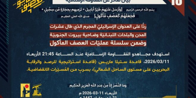 ردًّا على العدوان الإسرائيلي المجرم الذي طال عشرات المدن والبلدات اللبنانيّة بما فيها ضاحية بيروت الجنوبيّة، وضمن سلسلة عمليّات العصف المأكول، استهدف مجاهدو المُقاومة الإسلاميّة عند الساعة 21:45 الأربعاء 11/03/2026، قاعدة ستيلا ماريس (قاعدة استراتيجية للرصد والرقابة البحريين على مستوى الساحل الشمالي)، بسربٍ من المُسيّرات الانقضاضية.