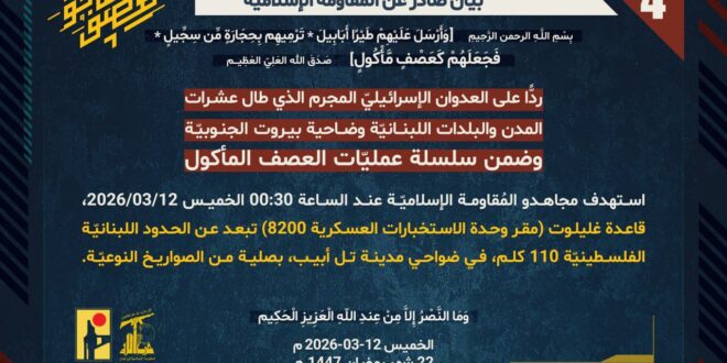 ردًّا على العدوان الإسرائيلي المجرم الذي طال عشرات المدن والبلدات اللبنانيّة وضاحية بيروت الجنوبيّة، وضمن سلسلة عمليّات العصف المأكول، استهدف مجاهدو المُقاومة الإسلاميّة عند الساعة 00:30 الخميس 12/03/2026، قاعدة غليلوت (مقر وحدة الاستخبارات العسكرية 8200) تبعد عن الحدود اللبنانيّة الفلسطينيّة 110 كلم، في ضواحي مدينة تل أبيب، بصلية من الصواريخ النوعيّة.
