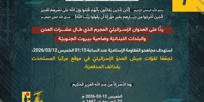 ردًّا على العدوان الإسرائيلي المجرم الذي طال عشرات المدن والبلدات اللبنانيّة وضاحية بيروت الجنوبيّة، استهدف مجاهدو المُقاومة الإسلاميّة عند الساعة 01:15 الخميس 12/03/2026، تجمّعًا لقوّات جيش العدوّ الإسرائيليّ في موقع مركبا المستحدث بقذائف المدفعيّة.