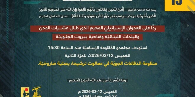ردًّا على العدوان الإسرائيلي المجرم الذي طال عشرات المدن والبلدات اللبنانيّة وضاحية بيروت الجنوبيّة، استهدف مجاهدو المُقاومة الإسلاميّة عند الساعة 15:30 الخميس 12/03/2026، للمرّة الثانية منظومة الدفاعات الجويّة في معالوت ترشيحا، بصلية صاروخيّة.