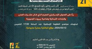 ردًّا على العدوان الإسرائيلي المجرم الذي طال عشرات المدن والبلدات اللبنانيّة وضاحية بيروت الجنوبيّة، استهدف مجاهدو المُقاومة الإسلاميّة عند الساعة 09:20 الخميس 12/03/2026، تجمعًا لجنود جيش العدو الإسرائيلي في تلّة الحمامص جنوب مدينة الخيام بصلية صاروخيّة.
