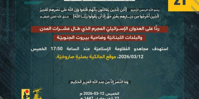 ردًّا على العدوان الإسرائيلي المجرم الذي طال عشرات المدن والبلدات اللبنانيّة وضاحية بيروت الجنوبيّة، استهدف مجاهدو المُقاومة الإسلاميّة عند الساعة 17:50 الخميس 12/03/2026، موقع المالكية بصليةٍ صاروخيّة.