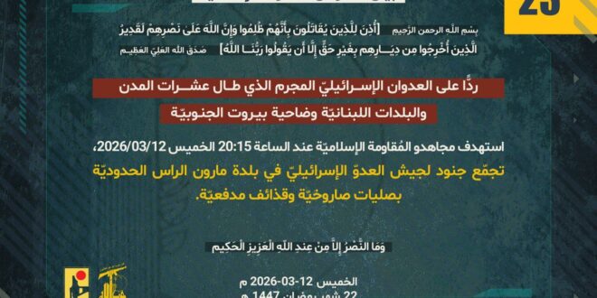 ردًّا على العدوان الإسرائيلي المجرم الذي طال عشرات المدن والبلدات اللبنانيّة وضاحية بيروت الجنوبيّة، استهدف مجاهدو المُقاومة الإسلاميّة عند الساعة 20:15 الخميس 12/03/2026، تجمّع جنود لجيش العدوّ الإسرائيليّ في بلدة مارون الراس الحدوديّة بصليات صاروخيّة وقذائف مدفعيّة.
