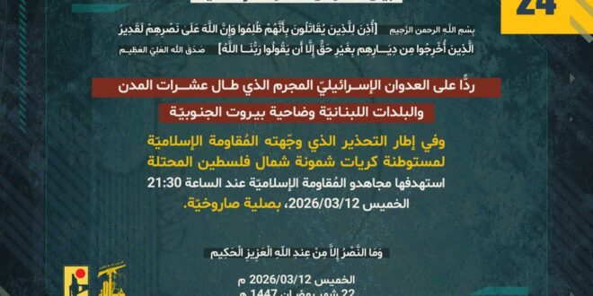 ردًّا على العدوان الإسرائيلي المجرم الذي طال عشرات المدن والبلدات اللبنانيّة وضاحية بيروت الجنوبيّة، وفي إطار التحذير الذي وجّهته المُقاومة الإسلاميّة لمستوطنة كريات شمونة، استهدفها مجاهدو المُقاومة الإسلاميّة عند الساعة 21:30 الخميس 12/03/2026، بصلية صاروخيّة.