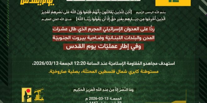 ردًّا على العدوان الإسرائيلي المجرم الذي طال عشرات المدن والبلدات اللبنانيّة وضاحية بيروت الجنوبيّة، وفي إطار عمليّات يوم القدس، استهدف مجاهدو المُقاومة الإسلاميّة عند الساعة 12:20 الجمعة 13/03/2026، مستوطنة كابري شمال فلسطين المحتلّة، بصلية صاروخيّة.