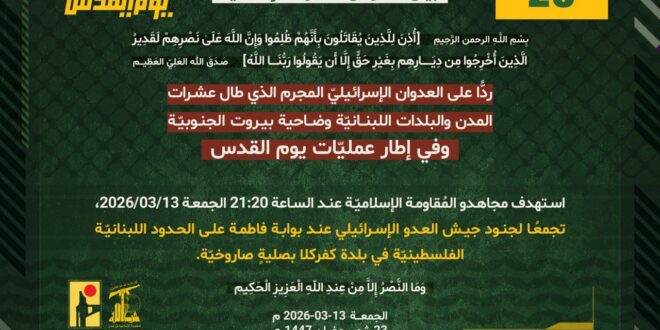 ردًّا على العدوان الإسرائيلي المجرم الذي طال عشرات المدن والبلدات اللبنانيّة وضاحية بيروت الجنوبيّة، وفي إطار عمليّات يوم القدس، استهدف مجاهدو المُقاومة الإسلاميّة عند الساعة 21:20 الجمعة 13/03/2026، تجمعًا لجنود جيش العدو الإسرائيلي عند بوابة فاطمة على الحدود اللبنانيّة الفلسطينيّة في بلدة كفركلا بصليةٍ صاروخيّة.