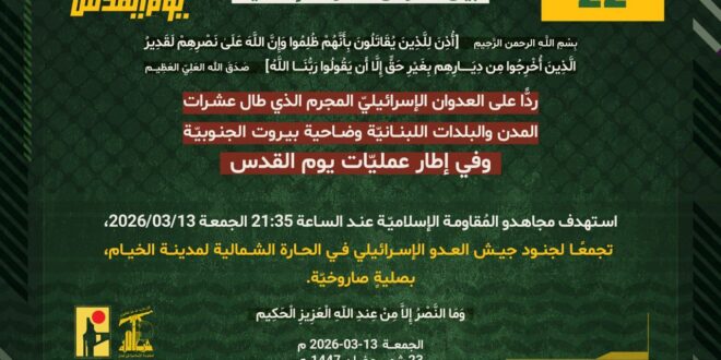 ردًّا على العدوان الإسرائيلي المجرم الذي طال عشرات المدن والبلدات اللبنانيّة وضاحية بيروت الجنوبيّة، وفي إطار عمليّات يوم القدس، استهدف مجاهدو المُقاومة الإسلاميّة عند الساعة 21:35 الجمعة 13/03/2026، تجمعًا لجنود جيش العدو الإسرائيلي في الحارة الشمالية لمدينة الخيام، بصليةٍ صاروخيّة.