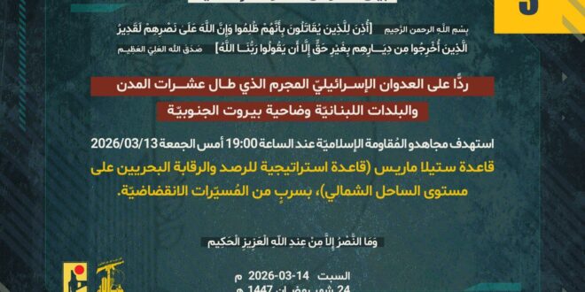 ردًّا على العدوان الإسرائيلي المجرم الذي طال عشرات المدن والبلدات اللبنانيّة وضاحية بيروت الجنوبيّة، استهدف مجاهدو المُقاومة الإسلاميّة عند الساعة 19:00 أمس الجمعة 13/03/2026، قاعدة ستيلا ماريس (قاعدة استراتيجية للرصد والرقابة البحريين على مستوى الساحل الشمالي)، بسربٍ من المُسيّرات الانقضاضيّة.