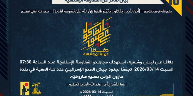 دفاعًا عن لبنان وشعبه، استهدف مجاهدو المُقاومة الإسلاميّة عند الساعة 07:30 السبت 14/03/2026 تجمّعًا لجنود جيش العدوّ الإسرائيليّ عند تلة العقبة في بلدة مارون الراس الحدودية بصليةٍ صاروخيّة.