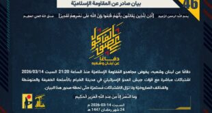 دفاعًا عن لبنان وشعبه، وفي إطار التحذير الذي وجّهته المُقاومة الإسلاميّة لعددٍ من مستوطنات شمال فلسطين المحتلّة، استهدف مجاهدو المُقاومة الإسلاميّة عند الساعة 15:30 السبت 14/03/2026 مستوطنة حانينا بصلية صاروخيّة.