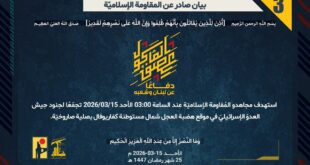 دفاعًا عن لبنان وشعبه، أسقط مجاهدو المُقاومة الإسلاميّة عند الساعة 19:30 السبت 14/03/2026 محلّقة مسلّحة تابعة لجيش العدو الإسرائيلي فوق بلدة الشرقيّة جنوب لبنان بالأسلحة المناسبة.